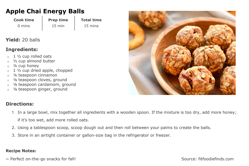 As an MCH trainee, I serve in a leadership role in our Public Health Nutrition Club. This club allows students from across the spectrum of public health to come together under a common interest of nutrition. One of our main activities is providing food demonstrations around campus. This past fall, we coordinated with the medical school to offer lunchtime demonstrations for their students. We prepared Kale Walnut Quinoa Salad with Honey Dijon Vinaigrette and Apple Chai Energy Balls, made with oats, almond butter, honey, and dried apples. The space we used allowed the attendees to follow along at their own stations as we prepared the recipes. At the end, they had created their own healthy lunch to go!
